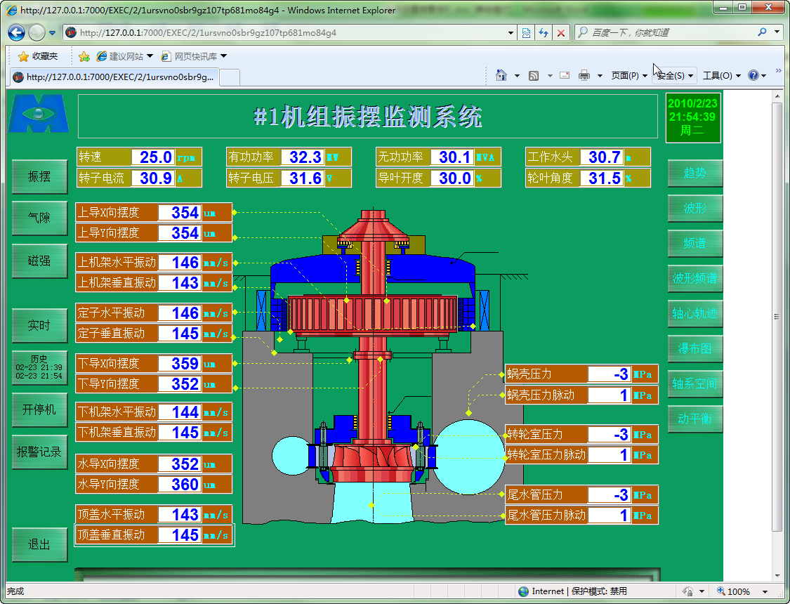 采用工业组态方式,能够在线编辑所要监测的数据(如通频幅值、特征频率幅值和特征参数等)以及表现形式,用户可对当前数据或各种历史数据进行多种显示与分析,以了解机组的当前运行状态。在屏幕上显示所监测对象结构简图及测点相应位置,并在测点所在位置附近动态显示最新的实时数据。